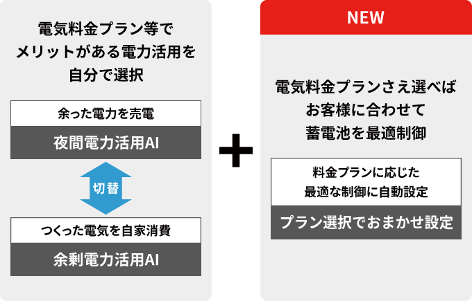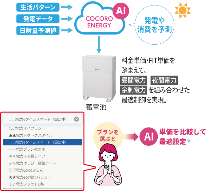 シャープのHEMSサービス(COCORO ENERGY)と連携すると、積極的に売電をしたいお客様、余剰電力を積極的に活用したいお客様のニーズに合わせて、AIが蓄電池を制御し、電気を賢く活用できます。さらに、ご契約している電気料金プランに応じた最適なAI制御を自動選択し、もっと電気を賢く活用できるよう進化を続けています。