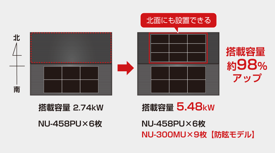 防眩モデルはこれまで設置できなかった北面にも設置することができ、搭載容量がアップ。