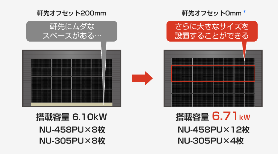 軒先から0mmの場所に設置可能(スマートラック工法)。搭載容量のアップが期待できます。