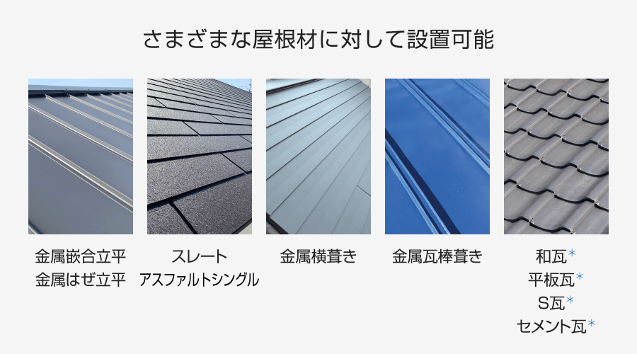 屋根材に合わせた各種の工法により、スレート/金属嵌合立平/金属はぜ立平/金属横葺き/金属瓦棒葺き/瓦*の屋根材に対応。