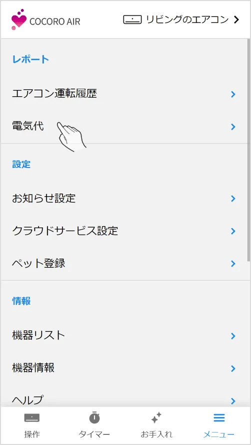 - メニュー画面内の電気代をタップします。