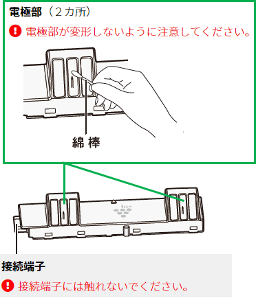 先を水で少し湿らせた市販の綿棒で電極部に付いたホコリや付着物を取り除いてください。
