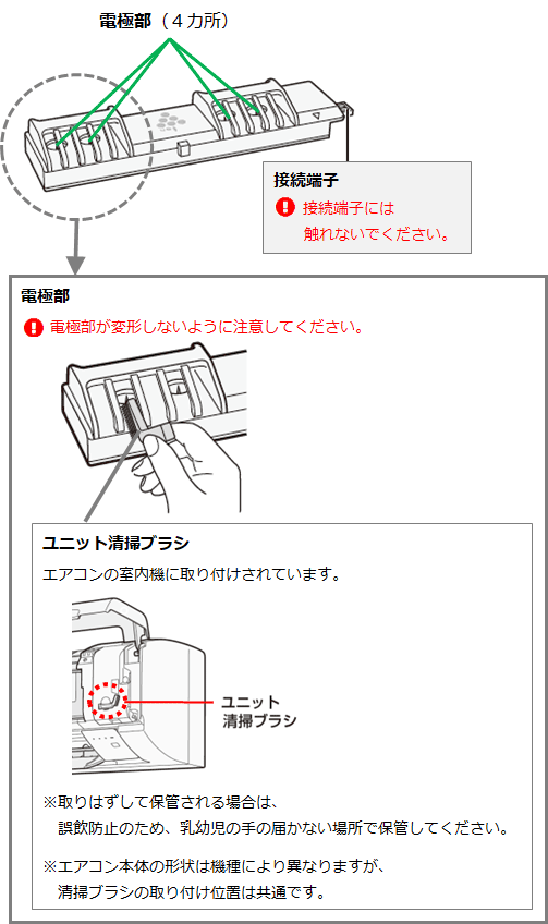 高濃度のプラズマクラスターイオンを安定して放出するために、定期的にユニットの電極部のお手入れをおこなってください。