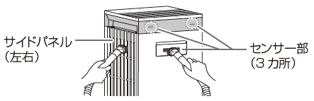 2.サイドパネル(左右)、センサー部(3カ所)のホコリを掃除機で吸い取り、本体を柔らかい布で拭き取る