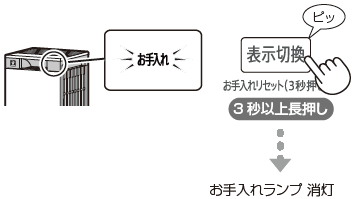 お手入れ後、運転を開始し、表示切換ボタンを3秒以上長押ししてお手入れランプを消灯させてください。