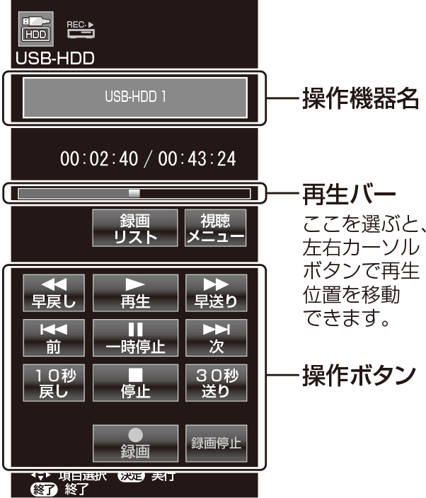 USBハードディスクを接続しているときは、ファミリンクパネルで、録画や再生などの操作ができます。