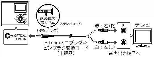 音声出力端子に、3.5mmミニプラグ⇔ピンプラグ変換コードで接続してください。