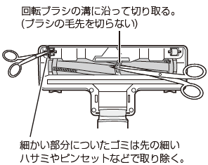回転ブラシにからみ付いたときは溝に沿って切り取る。(回転ブラシの毛先を切らない)