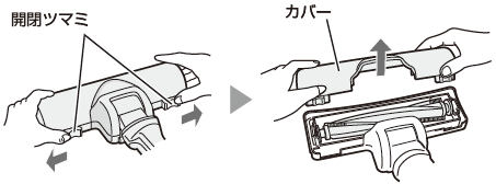 開閉ツマミ(左右2カ所)を「ひらく」の方向にスライドさせ、カバーをはずす。