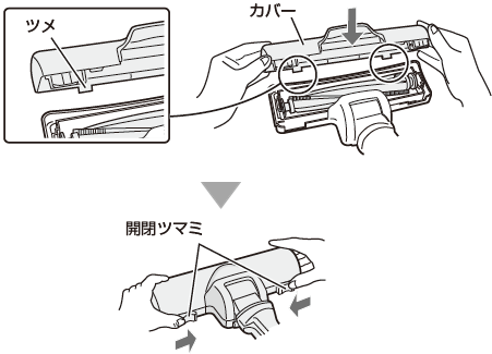 カバー前面のツメ(左右)を引っかけてからカバーを閉め、開閉ツマミを「しまる」の方向にスライドさせる。
