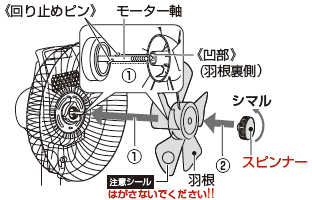 - 羽根の裏側の凹部をモーター軸の回り止めピンに合わせて差し込む。
