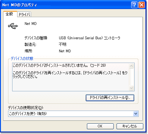 「USB(Universal Serial Bus)コントローラ」の項目の中に「Net MD」がありますので、右クリックしてプロパティを表示し、「ドライバーの再インストール」をクリックしてください。