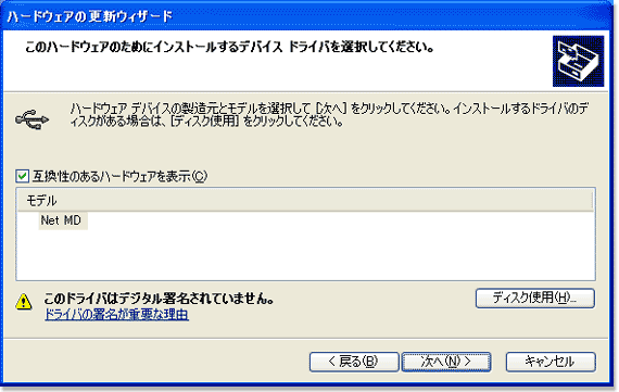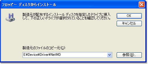 (CD-ROMドライブがEドライブの場合は、”E:\Device\Driver\Net MD”になります。)