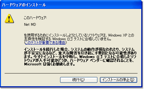 ドライバのインストールが開始される途中で、Windowsロゴテストがなされていないため下記のようなダイアログボックスが表示されますが、動作には問題ありませんので「続行」をクリックしてください。