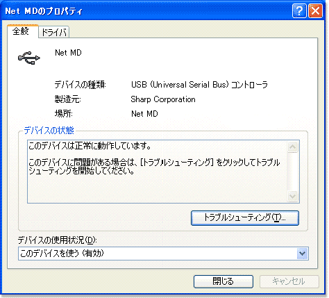「デバイスマネージャ」の「USB(Universal Serial Bus)コントローラ」の項目の「Net MD」を右クリックしてプロパティを表示してください。