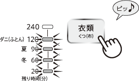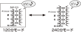 押すたびに120分、または240分モードに切り替わります。 ダニ対策をするときは、120分にセットしてください。