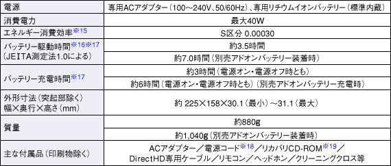 | 「JEITAバッテリ動作時間測定法(Ver.1.0)」に基づいて測定した時間です。 |