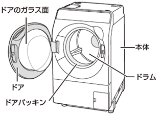 - ドア内側のガラス面やドアパッキンの表裏、プラスチック部に付いた糸くずやごみも必ず取り除く。