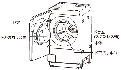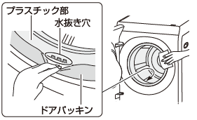 - ドア内側のガラス面やドアパッキンの表裏、プラスチック部に付いた糸くずやごみも必ず取り除く。