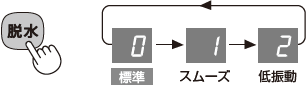 | 2 | 低振動 | 脱水時の振動を抑えたいとき 「標準」時よりも脱水中の振動が大きくなる前に修正運転を行います。 ※洗濯物によっては脱水時間が長くなったり、「E04」を表示することがあります。