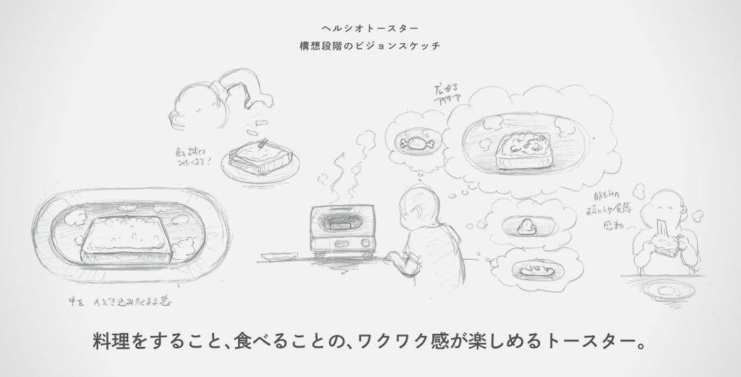 トースターを通して自分好みに作る楽しさや食べて味わう喜びを知ったような気がして、それが今回の「好みの食感に焼き上げられる」という機能とリンクすると感じました。そうした自分の体験から、大人も子どもも、むずかしいことを考えず、好奇心のまま、自分の理想の食感を探求させてくれる「キッチンの相棒」のようなトースターデザインを目指しました。