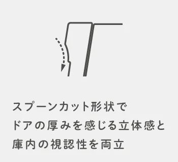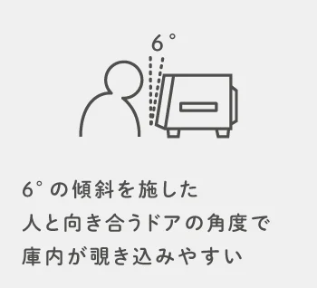 実は、庫内をのぞき込みやすくするためにドアに6°の傾斜をつけているんです。この傾斜によって製品と人が向き合った時に目線が合うような感覚になって、より親しみを覚える効果も狙っています。