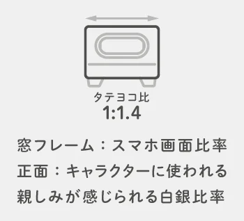 窓についてだけお話すると、頼もしく強そうなイメージを持たれるかもしれませんが、あくまでデザインコンセプトは「親しみやすさ」です。そこで、製品正面のサイズ比には親しみを感じると言われる白銀比(1:1.4)を採用しました。これはキャラクターデザインにも用いられる愛着を感じやすい比率とされています。