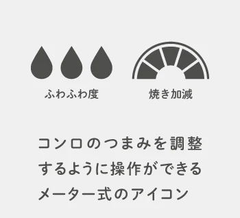 ワクワク感や好奇心をかき立てる使い心地を目指しました。このトースターの最大の特長は、ふわふわ度を3段階、焼き加減を5段階、掛け合わせて全15通りの焼き加減が選べること。当初はこの設定を「ふわふわ度3」「焼き加減1」と数字で表示する案があったんです。でも試作してみると、数字の食感表記は今回のトースターに採用するには無機質なものに感じて…。コンロのつまみで火の大きさを目で見ながら調整するように、難しいことは考えず、直感的に食感の操作ができるようなアイコン表現にこだわりました。ふわふわ度は水を使うので水滴の数で表現し、焼き加減はダイヤルを回すのと連動して扇状に変化していく。そうすることで、今まさに自分の手で食感を決めているという臨場感が得られるんです。自分の操作が見て分かるから、小さなお子さまでも触りながら設定が理解できるのも良い点です。